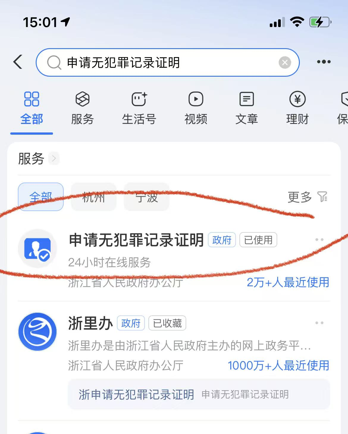 在支付宝里搜索“申请无犯罪记录证明” 自动跳转到浙里办小程序内申请;如下图(或者可从其他能获取无犯罪证明记录的渠道即可)